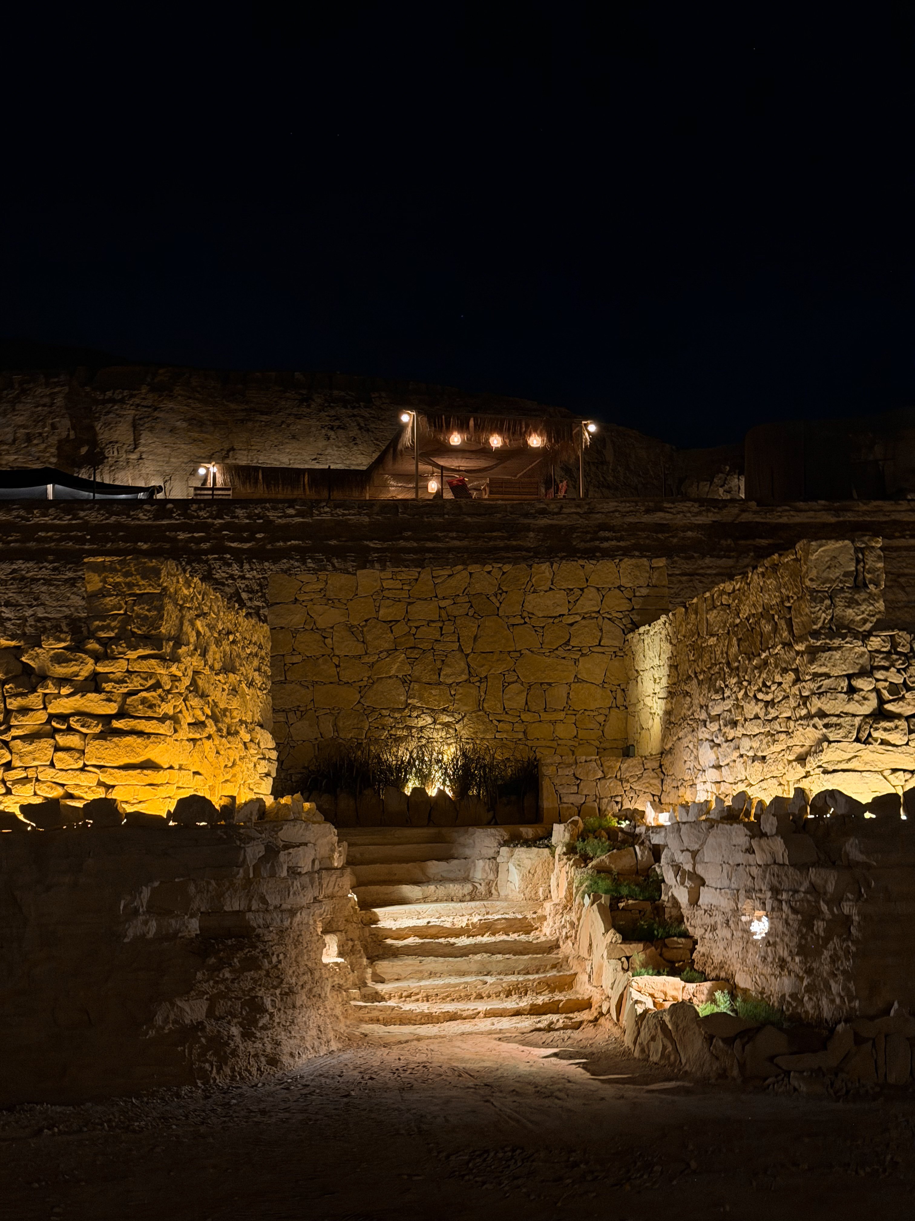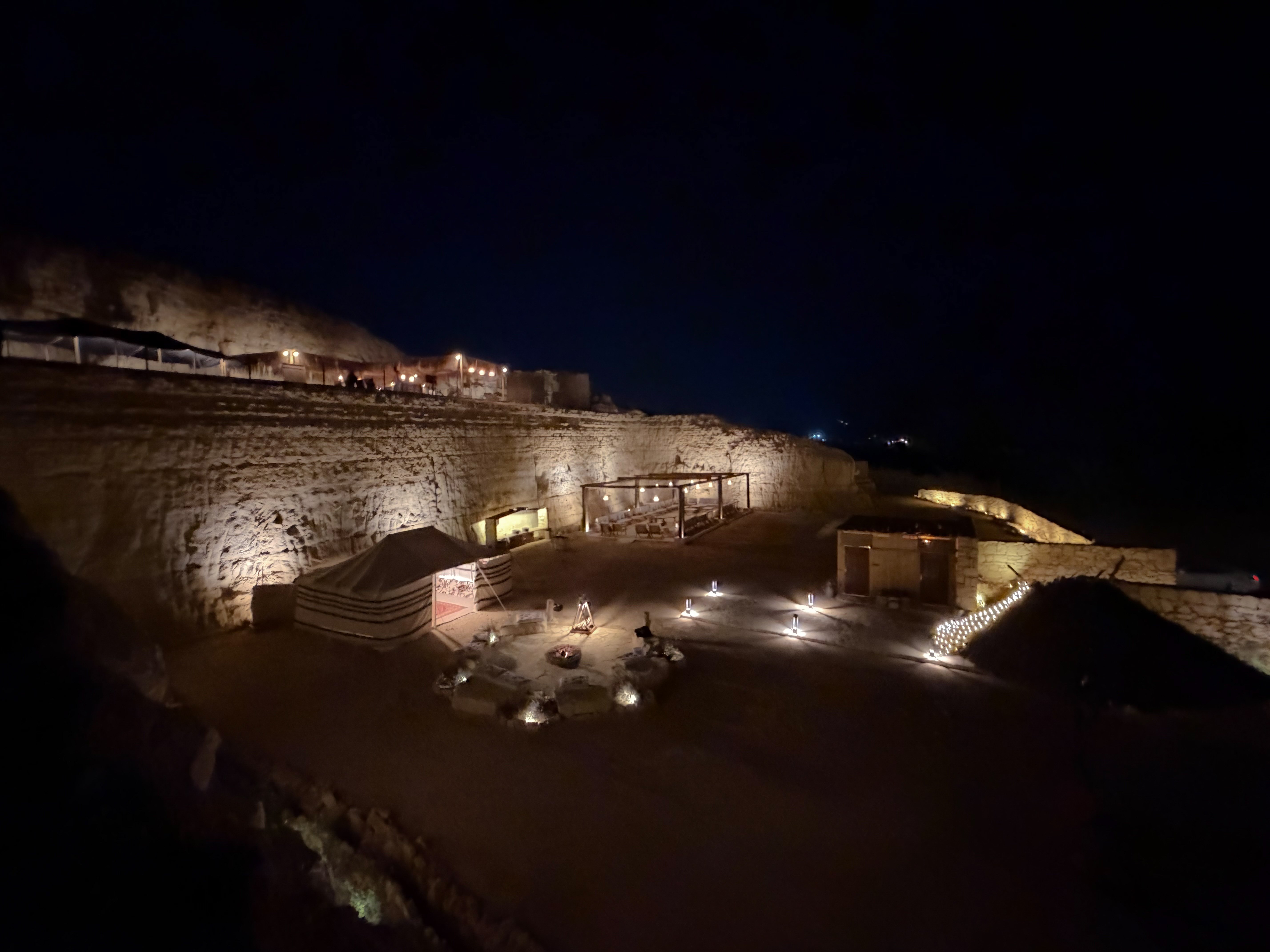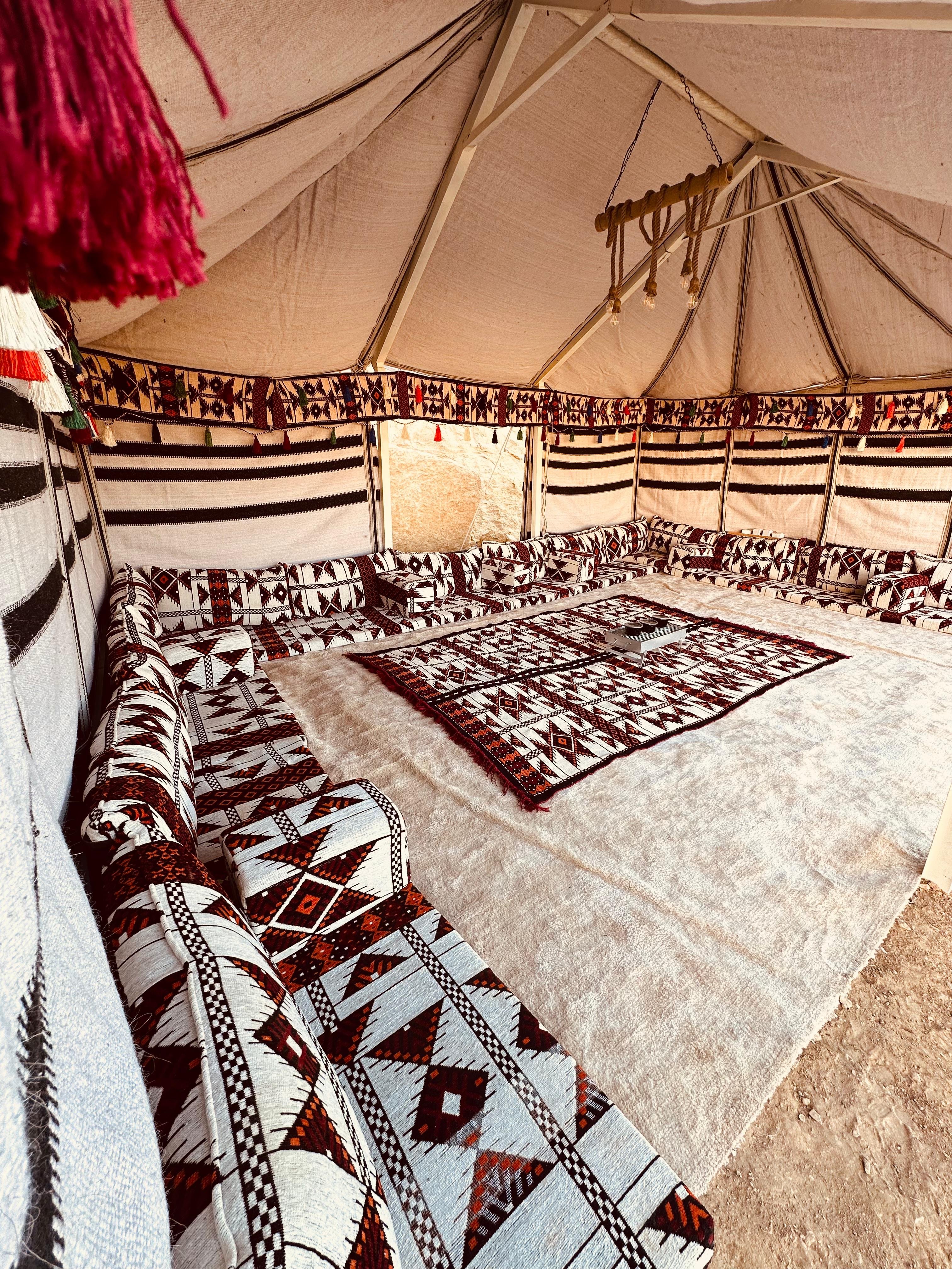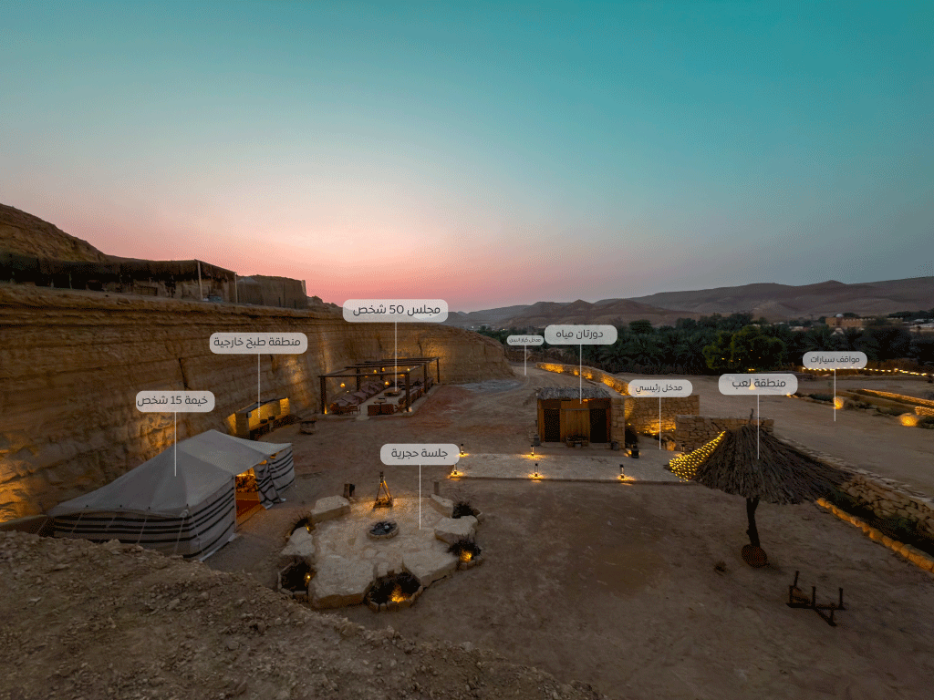 يتميّز المخيّم بإطلالته الجبلية من ثلاث جهات، وأناقة تصميمه، واتساعه لعدد يفوق 70 شخص.